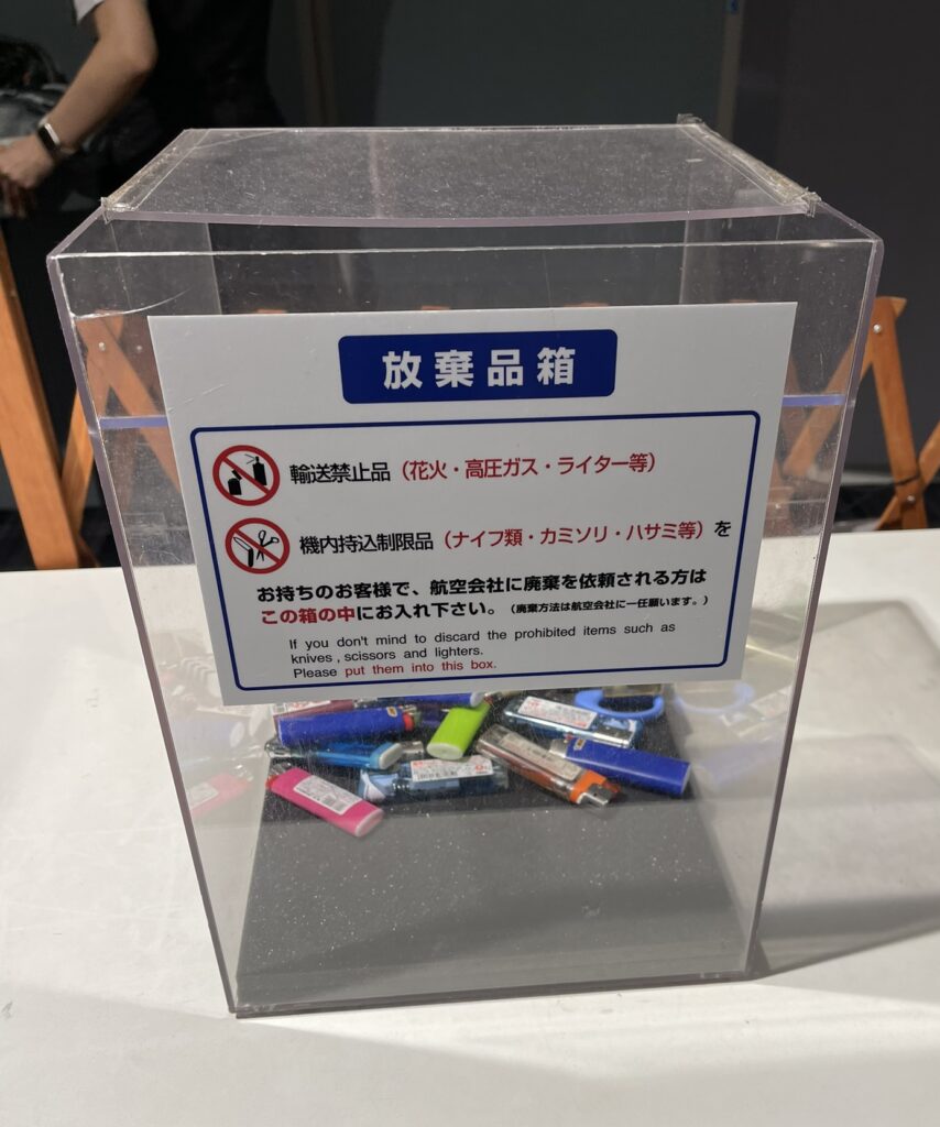 検査前に放棄品箱がありました。ライターやハサミ等は機内に持ち込めないとのこと。ハサミ等は事前に預ければOKです。