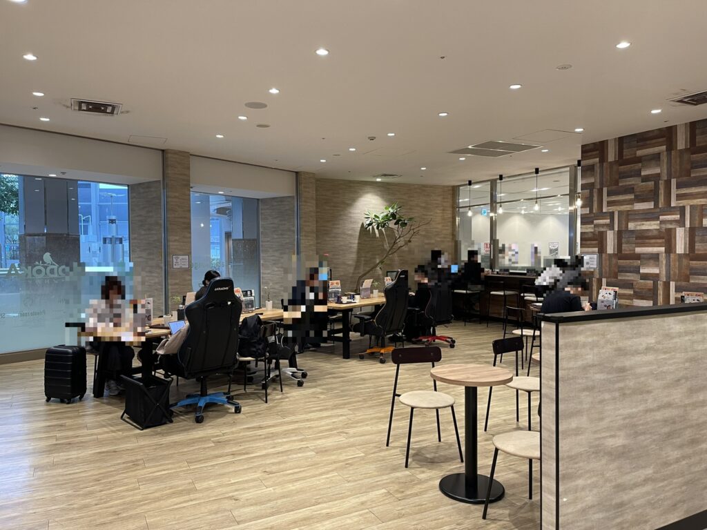 中の様子。ラウンジというかカフェに近いですね。制限時間は2時間で入場無料、ソフトドリンクはセルフサービスでした。